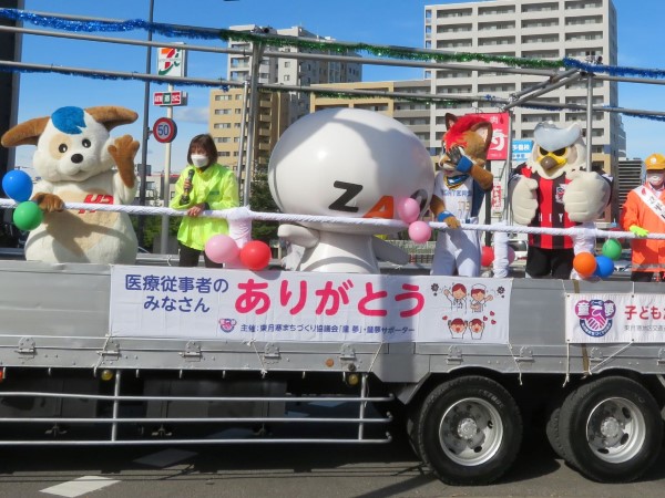 (株)ジェイコム札幌の社員が、東月寒地区で開催された交通安全街頭啓発に参加し、マスコットキャラクター「ざっくぅ」とともに交通安全の呼びかけを行いました。