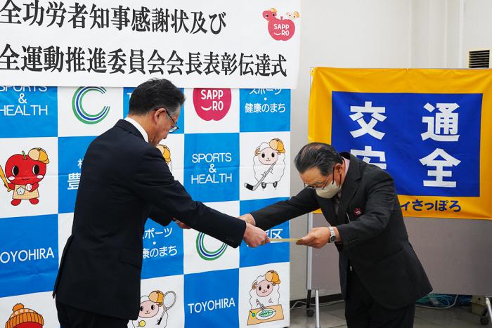 11月20日(水曜日)午後1時30分から、豊平区役所(平岸6条10丁目)で、「令和6年度交通安全功労者知事感謝状」と「令和6年度札幌市交通安全運動推進委員会会長表彰」の伝達式が行われた。