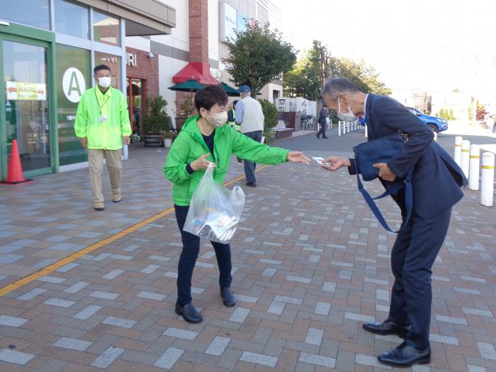 この日は、約20人が午後2時30分からイオン札幌西岡店とラッキー西岡店に分かれて、買い物に来店した地域の皆さんに、動物のマスコットの夜光反射材とポケットティッシュを配布し交通安全を呼びかけました。